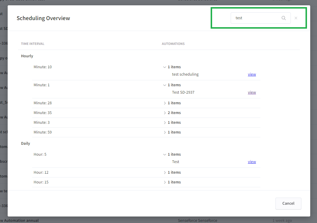In the Scheduling Overview popup, you will see all your existing active automations grouped by their scheduling. Please refer to the Trigger page for more information about the scheduling options.