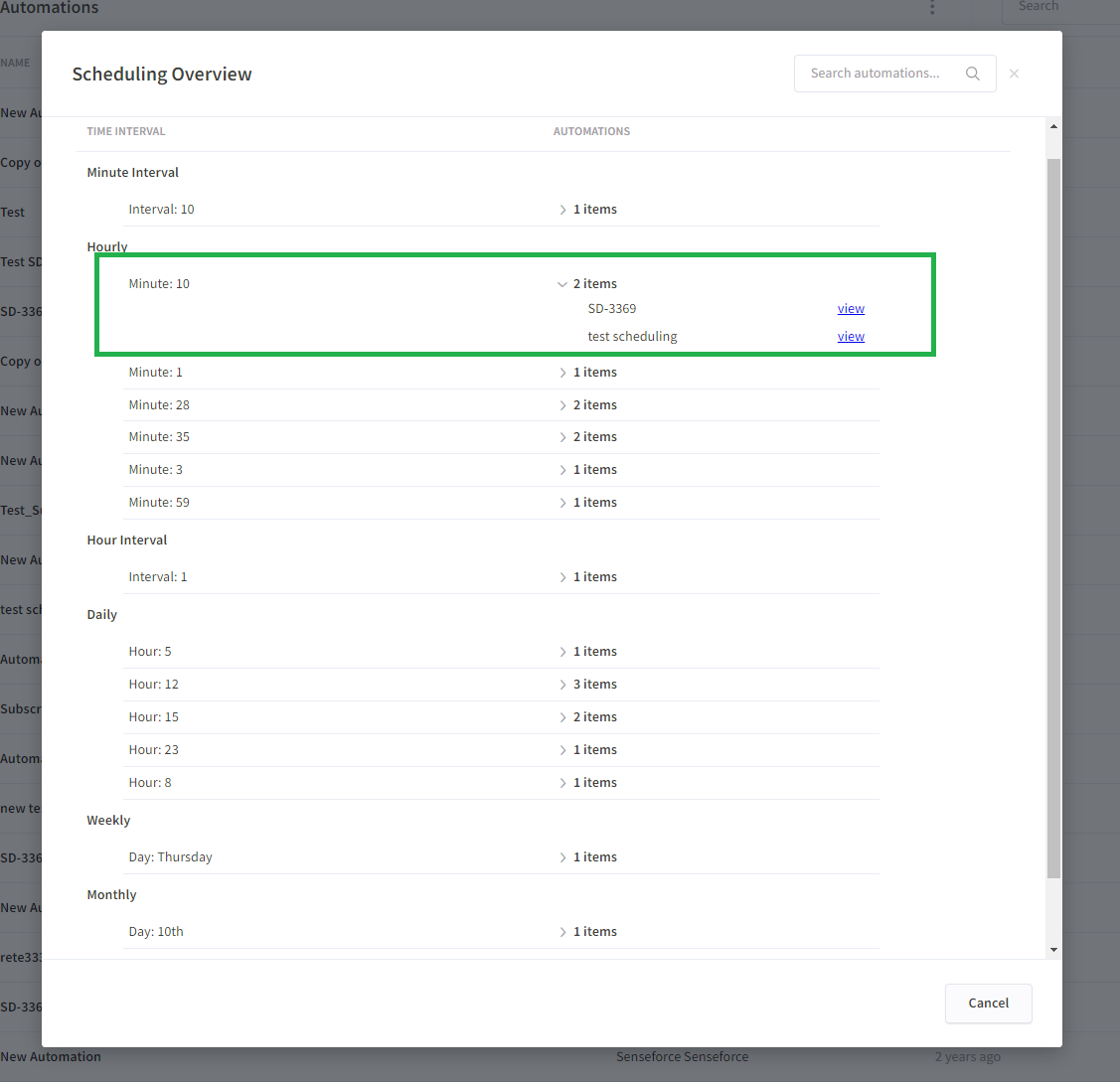 To view all the automations with the same interval, click the arrow next to the number of items. This will expand a tree component showing all the automations with the same interval.