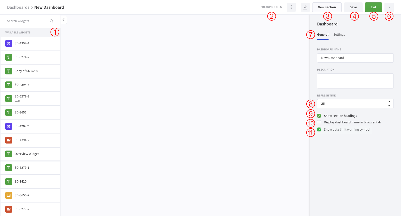 1. Searchable register of all available widgets. To place a widget in a section, just drag the desired widget into it.