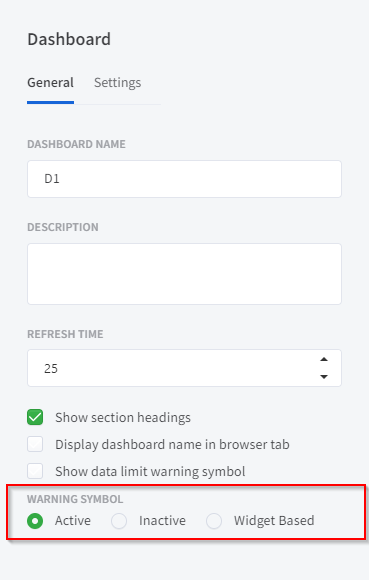 <figure><img src="https://1533098984-files.gitbook.io/~/files/v0/b/gitbook-x-prod.appspot.com/o/spaces%2F-Lj6tqYfpNT_59dZ_Z3Z%2Fuploads%2FMddoPnaUDaMfWSI5fgKI%2Fimage.png?alt=media&#x26;token=7fd61311-0d44-4975-963b-85a690023195" alt=""><figcaption><p>Warning symbol setting on dashboard level</p></figcaption></figure>